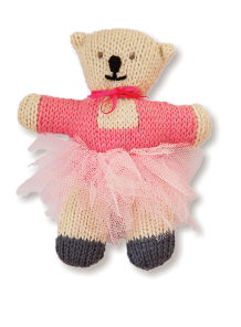 This cute teddy is knitted in one piece and then folded over at the top. Once assembled the skirt is added using net